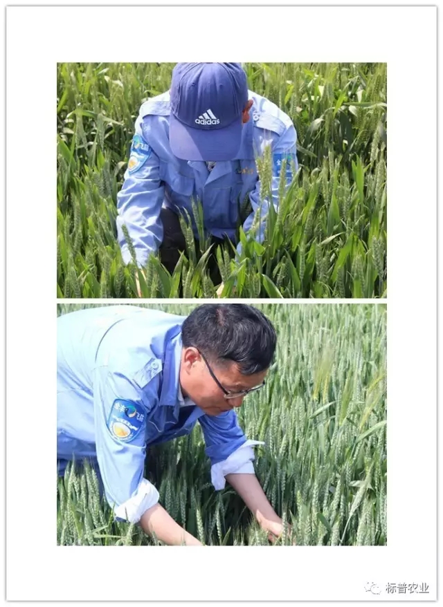 藥劑督察組的第一站來到作業(yè)點隆化村,組員們頂著烈日進(jìn)入田地調(diào)查病害,首先通過全豐無人機(jī)遙感技術(shù)對小麥病蟲害進(jìn)行了遙感定量監(jiān)測,發(fā)現(xiàn)這里是蚜蟲病害發(fā)生初期,還有條銹病和赤霉病。